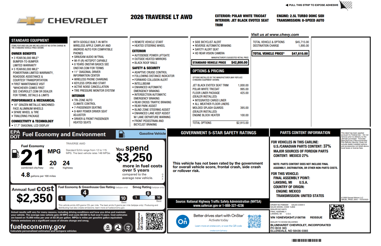 Listing: 2026 CHEVROLET TRAVERSE AWD 2LT